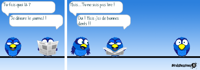 Case 1:Bird 1: Tu fais quoi là ?Bird 2: Je dévore le journal ! Case 2:Bird 1: Mais...Tu ne sais pas lire !Bird 2: Oui ! Mais j'ai de bonnes dents !! Case 3: