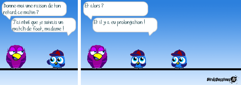 Case 1:Bird 1: Donne-moi une raison de ton retard ce matin ?Bird 2: J'ai rêvé que je suivais un match de foot, madame ! Case 2:Bird 1: Et alors ?Bird 2: Et il y a eu prolongation ! Case 3: