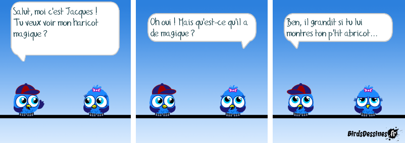 Case 1:Bird 1: Salut, moi c'est Jacques ! Tu veux voir mon haricot magique ? Case 2:Bird 1: Oh oui ! Mais qu'est-ce qu'il a de magique ? Case 3:Bird 1: Ben, il grandit si tu lui montres ton p'tit abricot...