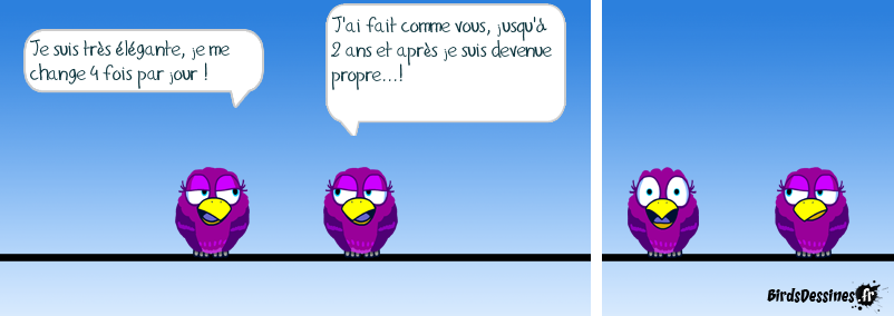 Case 1:Bird 1: Je suis très élégante, je me change 4 fois par jour ! Case 2:Bird 1: J'ai fait comme vous, jusqu'à 2 ans et après je suis devenue propre...! Case 3: