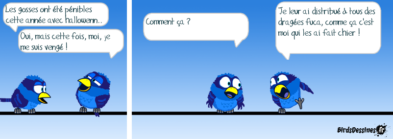 Case 1:Bird 1: Les gosses ont été pénibles cette année avec hallowenn..Bird 2: Oui, mais cette fois, moi, je me suis vengé ! Case 2:Bird 1: Comment ça ? Case 3:Bird 1: Je leur ai distribué à tous des dragées fuca, comme ça c'est moi qui les ai fait chier !