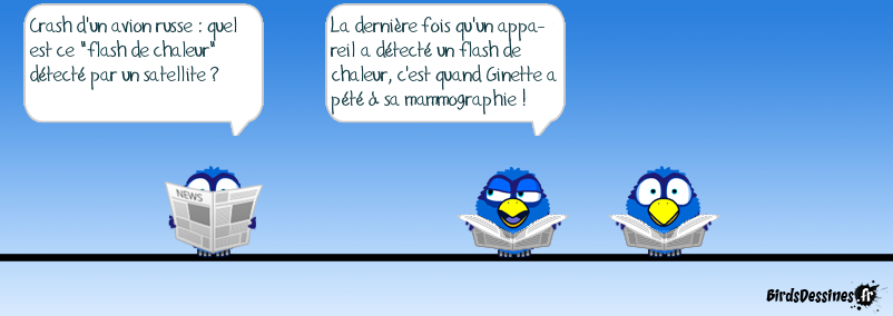 Case 1:Bird 1: Crash d'un avion russe : quel est ce "flash de chaleur" détecté par un satellite ? Case 2:Bird 1: La dernière fois qu'un appa-reil a détecté un flash de chaleur, c'est quand Ginette a pété à sa mammographie ! Case 3: