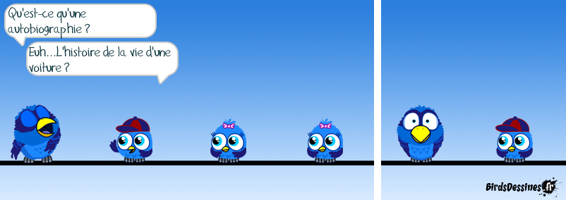 Case 1:Bird 1: Qu'est-ce qu'une autobiographie ?Bird 2: Euh...L'histoire de la vie d'une voiture ? Case 2: Case 3: