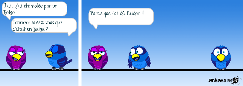 Case 1:Bird 1: J'ai...j'ai été violée par un Belge !Bird 2: Comment savez-vous que c'était un Belge ? Case 2:Bird 1: Parce que j'ai dû l'aider !! Case 3: