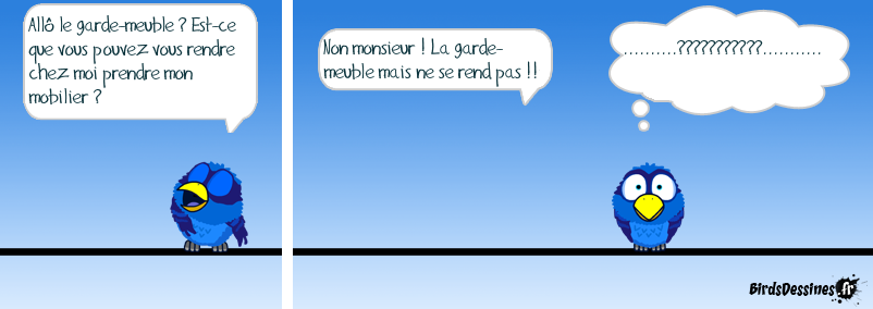 Case 1:Bird 1: Allô le garde-meuble ? Est-ce que vous pouvez vous rendre chez moi prendre mon mobilier ? Case 2:Bird 1: Non monsieur ! La garde-meuble mais ne se rend pas !! Case 3:Bird 1: ..........???????????...........