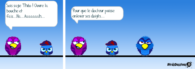 Case 1:Bird 1: Sois sage Théo ! Ouvre la bouche et fais...Ha...Aaaaaaah... Case 2:Bird 1: Pour que le docteur puisse enlever ses doigts... Case 3: