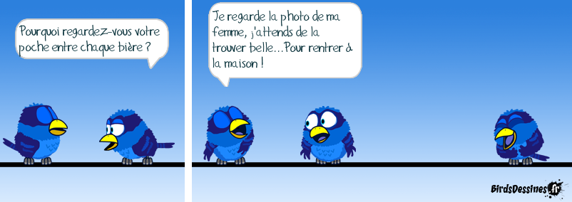 Case 1:Bird 1: Pourquoi regardez-vous votre poche entre chaque bière ? Case 2:Bird 1: Je regarde la photo de ma femme, j'attends de la trouver belle...Pour rentrer à la maison ! Case 3: