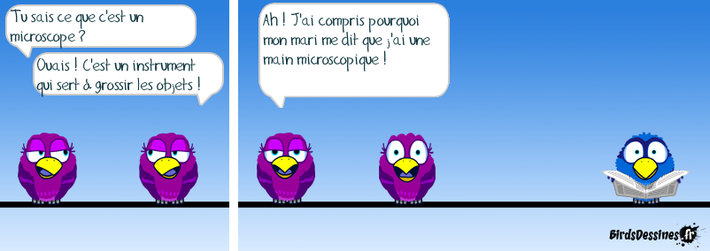 Case 1:Bird 1: Tu sais ce que c'est un microscope ?Bird 2: Ouais ! C'est un instrument qui sert à grossir les objets ! Case 2:Bird 1: Ah ! J'ai compris pourquoi mon mari me dit que j'ai une main microscopique ! Case 3: