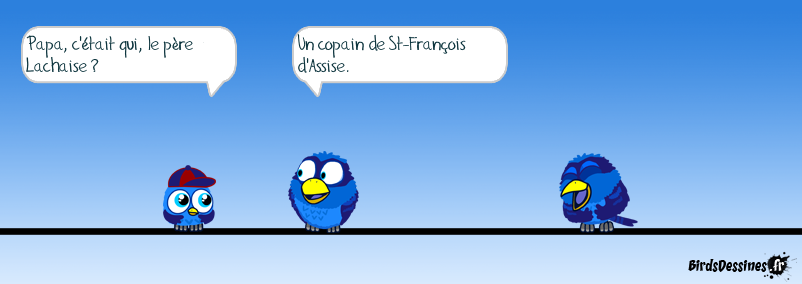 Case 1:Bird 1: Papa, c'était qui, le père Lachaise ? Case 2:Bird 1: Un copain de St-François d'Assise. Case 3: