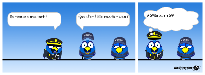 Case 1:Bird 1: Ma femme a un amant ! | Case 2: Bird 1: Quoi chef ! Elle nous fait cocu ? | Case 3: Bird 1: #@%Groarrrr@#