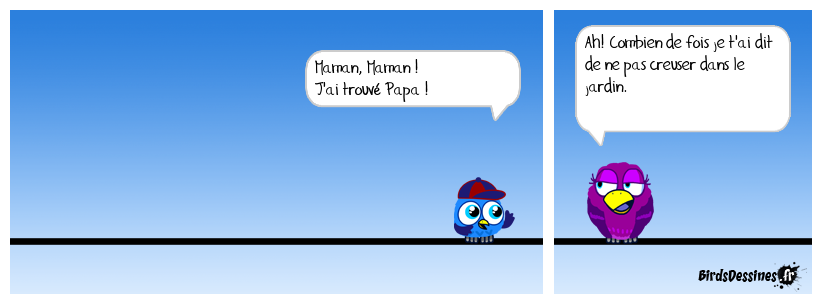 Case 1: | Case 2: Bird 1: Maman, Maman ! J'ai trouvé Papa ! | Case 3: Bird 1: Ah! Combien de fois je t'ai dit de ne pas creuser dans le jardin.