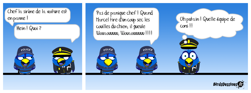 Case 1:Bird 1: Chef la sirène de la voiture est en panne !Bird 2: Hein ! Quoi ? | Case 2: Bird 1: Pas de panique chef ! Quand Marcel tire d'un coup sec les couilles du chien, il gueule Wouaouuuuu, Wouaouuuuuu !!!! | Case 3: Bird 1: Oh putain ! Quelle équipe de cons !!