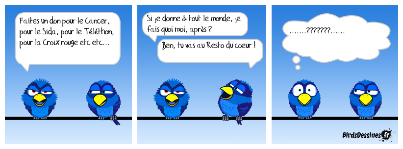 Case 1:Bird 1: Faites un don pour le Cancer, pour le Sida, pour le Téléthon, pour la Croix rouge etc etc... | Case 2: Bird 1: Si je donne à tout le monde, je fais quoi moi, après ? Bird 2: Ben, tu vas au Resto du coeur ! | Case 3: Bird 1: .......???????......