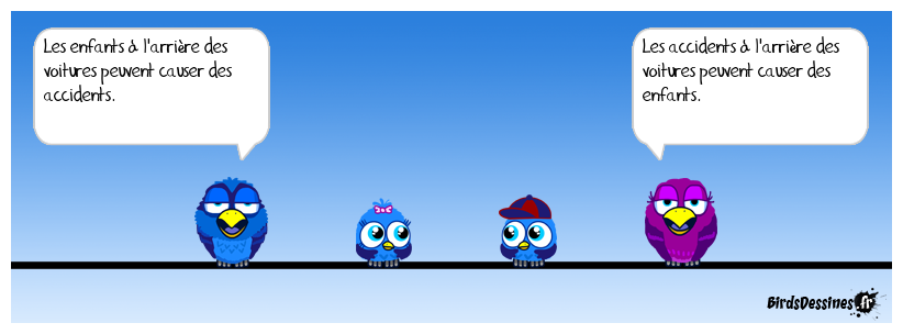 Case 1:Bird 1: Les enfants à l'arrière des voitures peuvent causer des accidents. | Case 2: | Case 3: Bird 1: Les accidents à l'arrière des voitures peuvent causer des enfants.