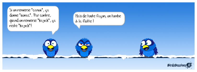 Case 1:Bird 1: Si on renverse "canoë", ça donne "ëonac". Par contre, quand on renverse "kayak", ça reste "kayak"! | Case 2: Bird 1: Mais de toute façon, on tombe à la flotte ! | Case 3:
