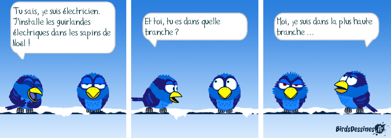 Case 1:Bird 1: Tu sais, je suis électricien. J'installe les guirlandes électriques dans les sapins de Noël ! Case 2:Bird 1: Et toi, tu es dans quelle branche ? Case 3:Bird 1: Moi, je suis dans la plus haute branche ...