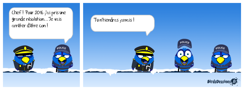 Case 1:Bird 1: Chef ! Pour 2016 j'ai pris une grande résolution...Je vais arrêter d'être con ! | Case 2: Bird 1: Tu n'tiendras jamais ! | Case 3: