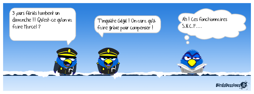 Case 1:Bird 1: 3 jours fériés tombent un dimanche !! Qu'est-ce qu'on va faire Marcel ? | Case 2: Bird 1: T'inquiète Gégé ! On aura qu'à faire grève pour compenser ! | Case 3: Bird 1: Ah ! Ces fonctionnaires S.N.C.F....