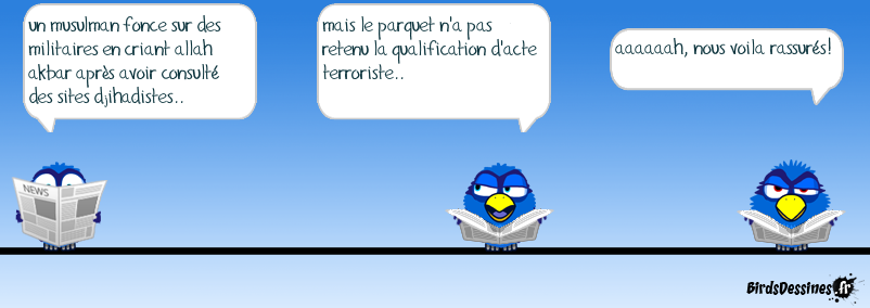 Case 1:Bird 1: un musulman fonce sur des militaires en criant allah akbar après avoir consulté des sites djihadistes.. Case 2:Bird 1: mais le parquet n'a pas retenu la qualification d'acte terroriste.. Case 3:Bird 1: aaaaaah, nous voila rassurés!