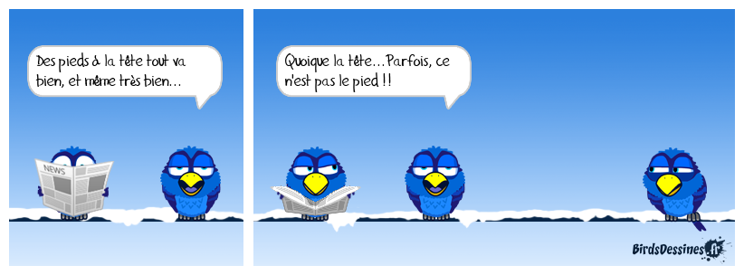Case 1:Bird 1: Des pieds à la tête tout va bien, et même très bien... | Case 2: Bird 1: Quoique la tête...Parfois, ce n'est pas le pied !! | Case 3:
