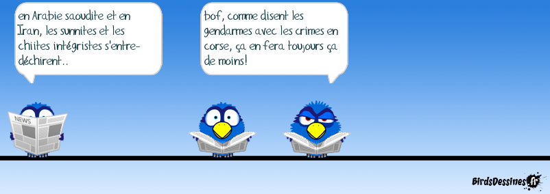 Case 1:Bird 1: en Arabie saoudite et en Iran, les sunnites et les chiites intégristes s'entre-déchirent.. Case 2:Bird 1: bof, comme disent les gendarmes avec les crimes en corse, ça en fera toujours ça de moins! Case 3: