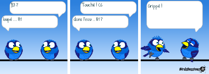 Case 1:Bird 1: B3 ?Bird 2: loupé ... H1 Case 2:Bird 1: Touché ! C6Bird 2: dans l'eau .. N1 ? Case 3:Bird 1: Grippé !