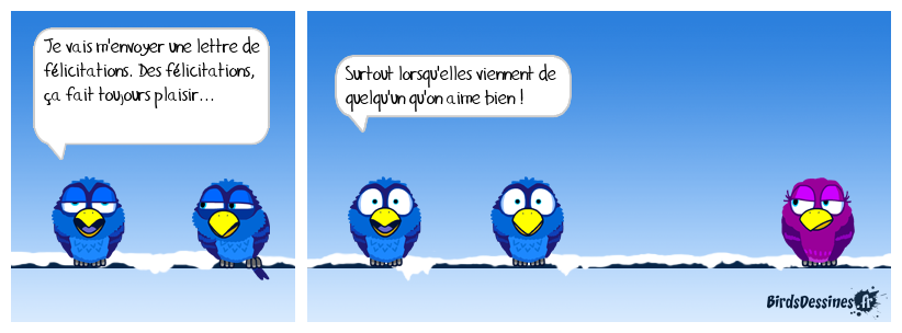Case 1:Bird 1: Je vais m'envoyer une lettre de félicitations. Des félicitations, ça fait toujours plaisir... | Case 2: Bird 1: Surtout lorsqu'elles viennent de quelqu'un qu'on aime bien ! | Case 3: