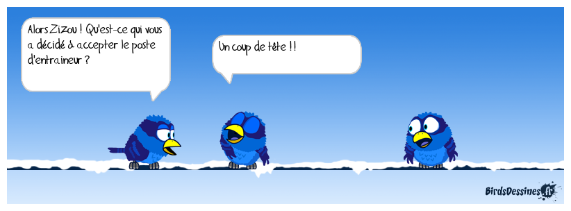 Case 1:Bird 1: Alors Zizou ! Qu'est-ce qui vous a décidé à accepter le poste d'entraineur ? | Case 2: Bird 1: Un coup de tête !! | Case 3: