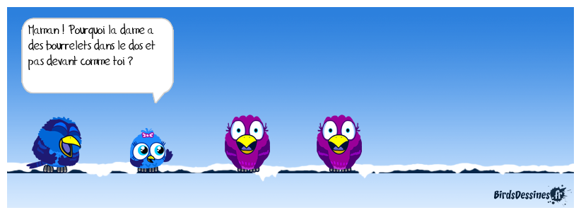 Case 1:Bird 1: Maman ! Pourquoi la dame a des bourrelets dans le dos et pas devant comme toi ? | Case 2: | Case 3: