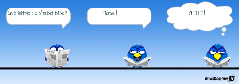 Case 1:Bird 1: En 5 lettres : alphabet bête ? Case 2:Bird 1: Morse ! Case 3:Bird 1: Pfffff !