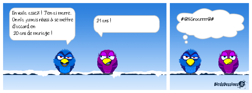 Case 1:Bird 1: En voila assez ! J'en ai marre. On n'a jamais réussi à se mettre d'accord en 20 ans de mariage ! | Case 2: Bird 1: 21 ans ! | Case 3: Bird 1: #@%Groarrrr@#