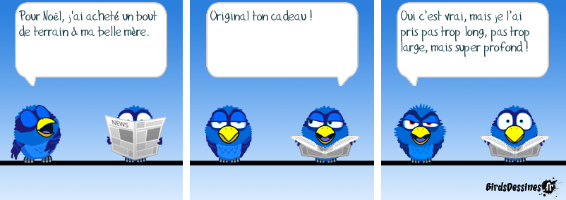 Case 1:Bird 1: Pour Noël, j'ai acheté un bout de terrain à ma belle mère. Case 2:Bird 1: Original ton cadeau ! Case 3:Bird 1: Oui c’est vrai, mais je l’ai pris pas trop long, pas trop large, mais super profond !