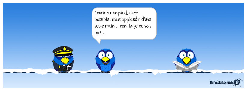Case 1: | Case 2: Bird 1: Courir sur un pied, c'est possible, mais applaudir d'une seule main... non, là je ne vois pas... | Case 3: