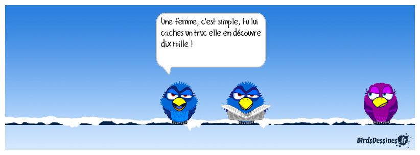 Case 1: | Case 2: Bird 1: Une femme, c'est simple, tu lui caches un truc elle en découvre dix mille ! | Case 3: