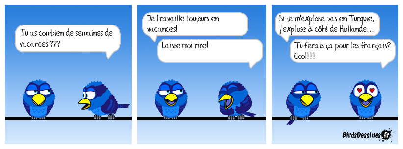 Case 1:Bird 1: Tu as combien de semaines de vacances ??? | Case 2: Bird 1: Je travaille toujours en vacances! Bird 2: Laisse moi rire! | Case 3: Bird 1: Si je m'explose pas en Turquie, j'explose à côté de Hollande... Bird 2: Tu ferais ça pour les français? Cool!!!