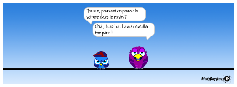 Case 1: | Case 2: Bird 1: Maman, pourquoi on pousse la voiture dans le ravin ? Bird 2: Chut, tais-toi, tu vas reveiller ton père ! | Case 3: