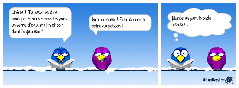 Case 1:Bird 1: Chérie ! Tu peux me dire pourquoi tu verses tous les jours un verre d'eau, matin et soir dans l'aquarium ? | Case 2: Bird 1: Bin mon cœur ! Pour donner à boire au poisson ! | Case 3: Bird 1: Blonde un jour, blonde toujours...
