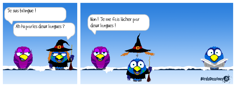 Case 1:Bird 1: Je suis bilingue ! Bird 2: Ah tu parles deux langues ? | Case 2: Bird 1: Non ! Je me fais lècher par deux langues ! | Case 3: