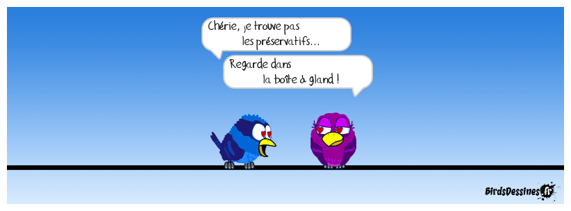 Case 1: | Case 2: Bird 1: Chérie, je trouve pas les préservatifs... Bird 2: Regarde dans la boïte à gland ! | Case 3: