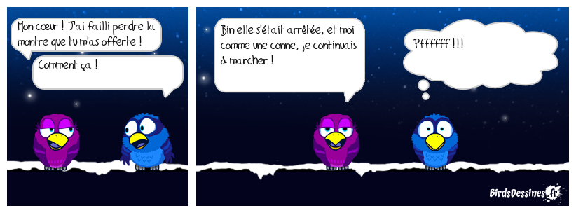 Case 1:Bird 1: Mon cœur ! J'ai failli perdre la montre que tu m'as offerte !Bird 2: Comment ça ! | Case 2: Bird 1: Bin elle s'était arrêtée, et moi comme une conne, je continuais à marcher ! | Case 3: Bird 1: Pffffff !!!