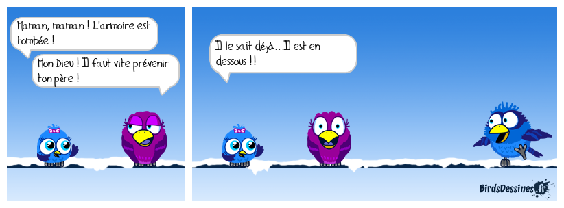 Case 1:Bird 1: Maman, maman ! L'armoire est tombée !Bird 2: Mon Dieu ! Il faut vite prévenir ton père ! | Case 2: Bird 1: Il le sait déjà...Il est en dessous !! | Case 3: