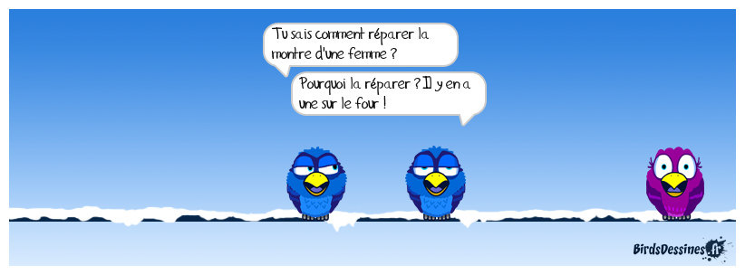 Case 1: | Case 2: Bird 1: Tu sais comment réparer la montre d'une femme ? Bird 2: Pourquoi la réparer ? Il y en a une sur le four ! | Case 3: