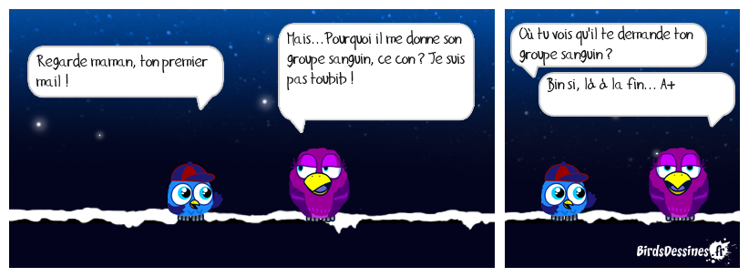 Case 1:Bird 1: Regarde maman, ton premier mail ! | Case 2: Bird 1: Mais...Pourquoi il me donne son groupe sanguin, ce con ? Je suis pas toubib ! | Case 3: Bird 1: Où tu vois qu'il te demande ton groupe sanguin ? Bird 2: Bin si, là à la fin... A+