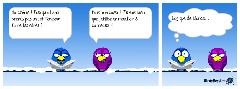 Case 1:Bird 1: Ma chérie ! Pourquoi tu ne prends pas un chiffon pour faire les vitres ? | Case 2: Bird 1: Mais mon coeur ! Tu vois bien que j'utilise un mouchoir à carreaux !! | Case 3: Bird 1: Logique de blonde...