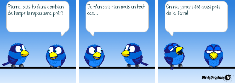 Case 1:Bird 1: Pierre, sais-tu dans combien de temps le repas sera prêt? Case 2:Bird 1: Je n'en sais rien mais en tout cas... Case 3:Bird 1: On n'a jamais été aussi près de la faim!
