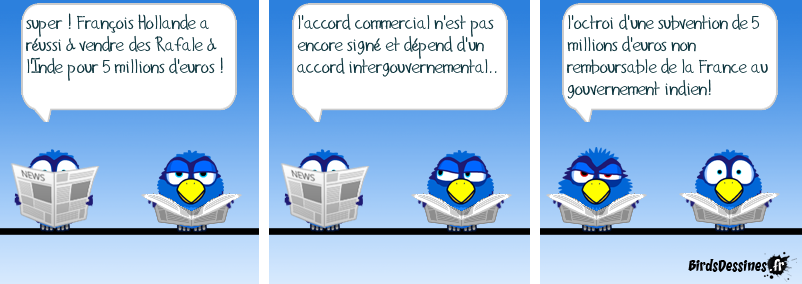 Case 1:Bird 1: super ! François Hollande a réussi à vendre des Rafale à l'Inde pour 5 millions d'euros ! Case 2:Bird 1: l'accord commercial n'est pas encore signé et dépend d'un accord intergouvernemental.. Case 3:Bird 1: l'octroi d'une subvention de 5 millions d'euros non remboursable de la France au gouvernement indien!
