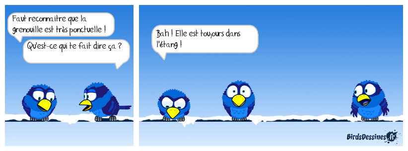 Case 1:Bird 1: Faut reconnaitre que la grenouille est très ponctuelle ! Bird 2: Qu'est-ce qui te fait dire ça ? | Case 2: Bird 1: Bah ! Elle est toujours dans l'étang ! | Case 3: