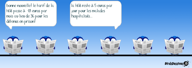 Case 1:Bird 1: bonne nouvelle! le tarif de la télé passe à 18 euros par mois au lieu de 36 pour les détenus en prison! Case 2:Bird 1: la télé reste à 5 euros par jour pour les malades hospitalisés.. Case 3: