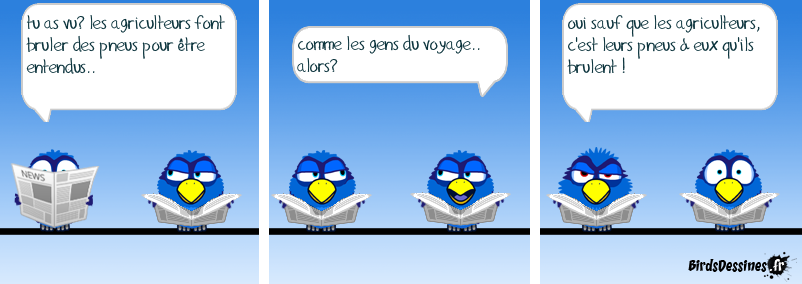 Case 1:Bird 1: tu as vu? les agriculteurs font bruler des pneus pour être entendus.. Case 2:Bird 1: comme les gens du voyage.. alors? Case 3:Bird 1: oui sauf que les agriculteurs, c'est leurs pneus à eux qu'ils brulent !