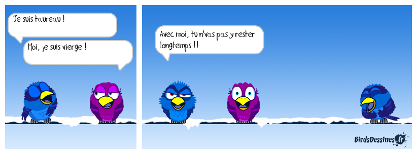 Case 1:Bird 1: Je suis taureau !Bird 2: Moi, je suis vierge ! | Case 2: Bird 1: Avec moi, tu n'vas pas y rester longtemps !! | Case 3: